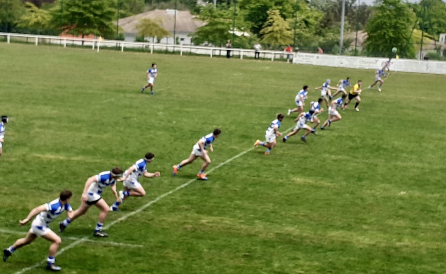 Très belle victoire de nos cadets dans ce ¼ de finale niveau A de la Nouvelle Aquitaine. Nos cadets ont réussi d’entrée  de jeu à imposer le rythme et leur impact physique pour avancer sur chaque phase de jeu. Bien plus entreprenant dans le jeu, nos joueurs ont rapidement pris le score dès la 9èmeminute . S’en est suivi d’une belle période de domination de nos joueurs qui prendront l’écart au score avant la mi temps ( 10- 23 pour les bleus et blancs). En début de seconde période, nos joueurs sont repartis sur le même rythme en inscrivant 2 essais supplémentaires en 10 minutes. Suite à ce score à notre avantage, nous avons pu faire participer tous les joueurs en faisant de nombreux remplacements. Score finale de 35-10 en notre faveur, ce qui permet au groupe cadet de se hisser en demi finale !!
